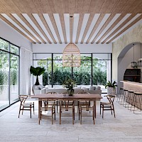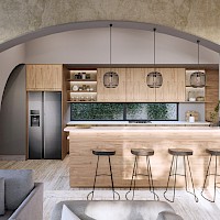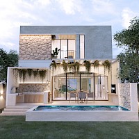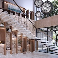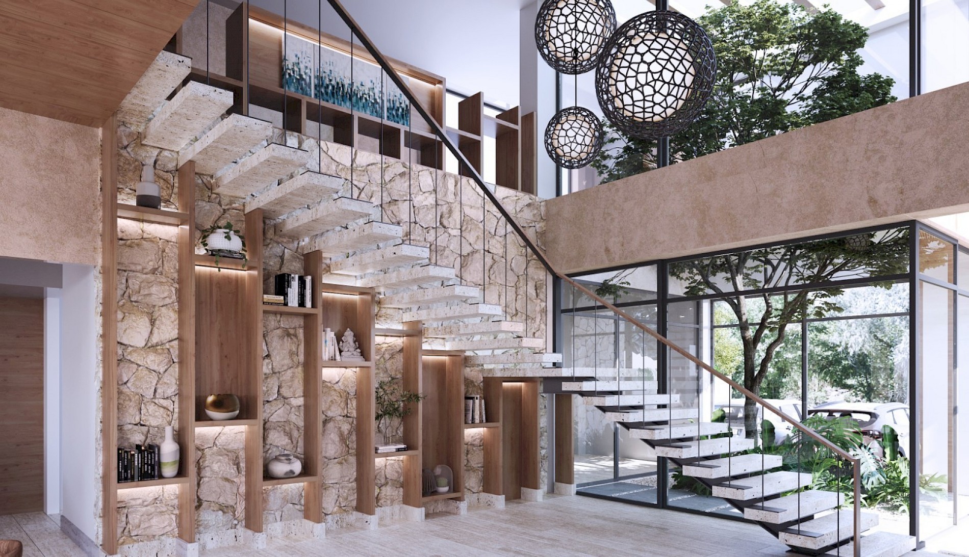 El modelo Balám 232 se caracteriza por tener una distribución en dos plantas con cuatro amplias habitaciones, una de ellas en planta baja para mayor comodidad, además de un vestíbulo a doble altura y un shoot de basura en el segundo nivel que va directo al cuarto de lavado.