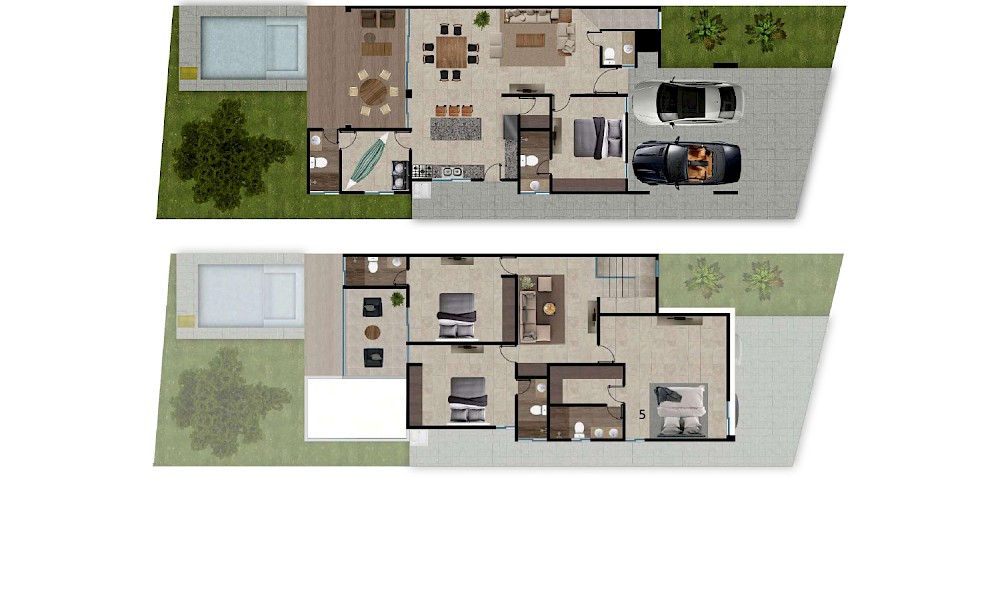 Este modelo se caracteriza por su armoniosa distribución en dos plantas, con tres habitaciones en planta alta, además de un family room.