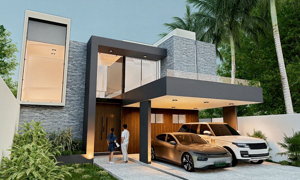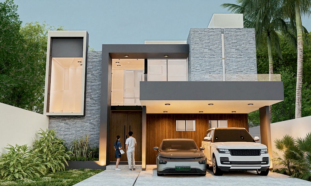 Este modelo se caracteriza por su diseño arquitectónico y contar con dos espacios independientes y adicionales a las tres habitaciones en planta alta.