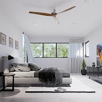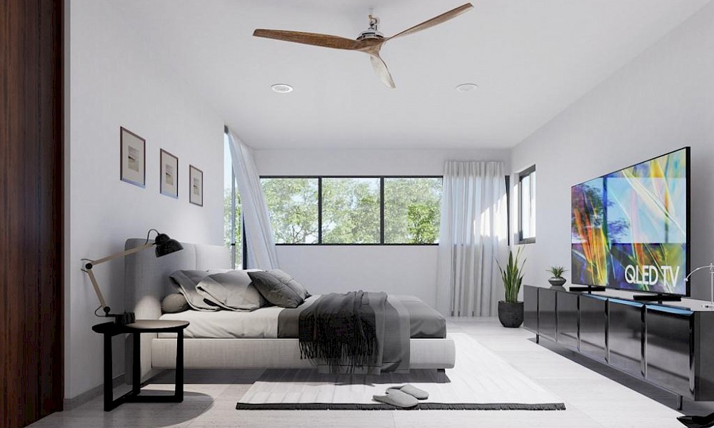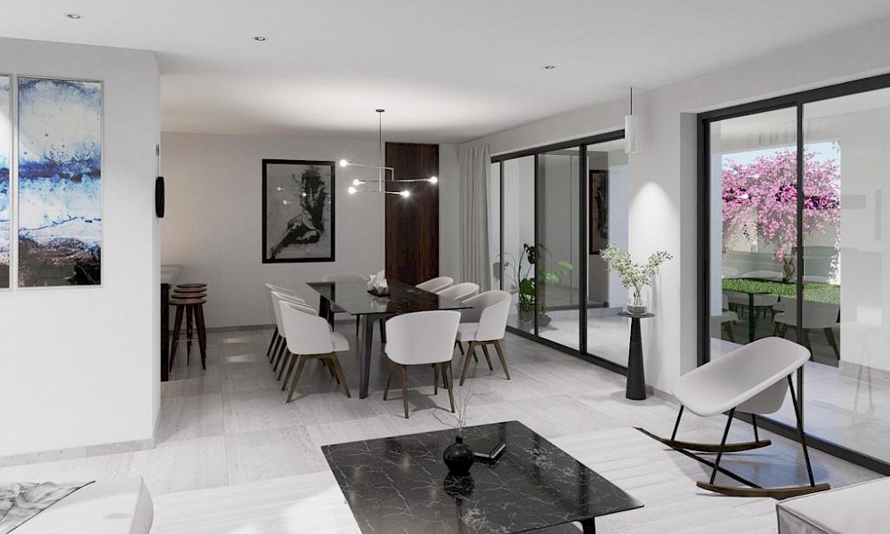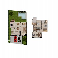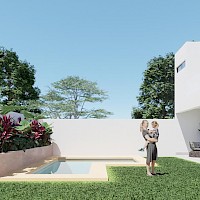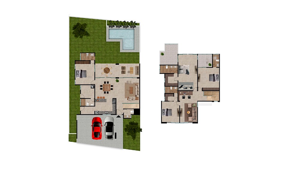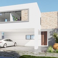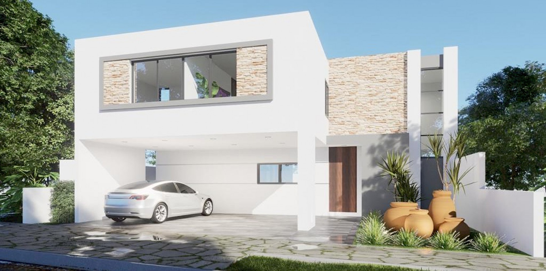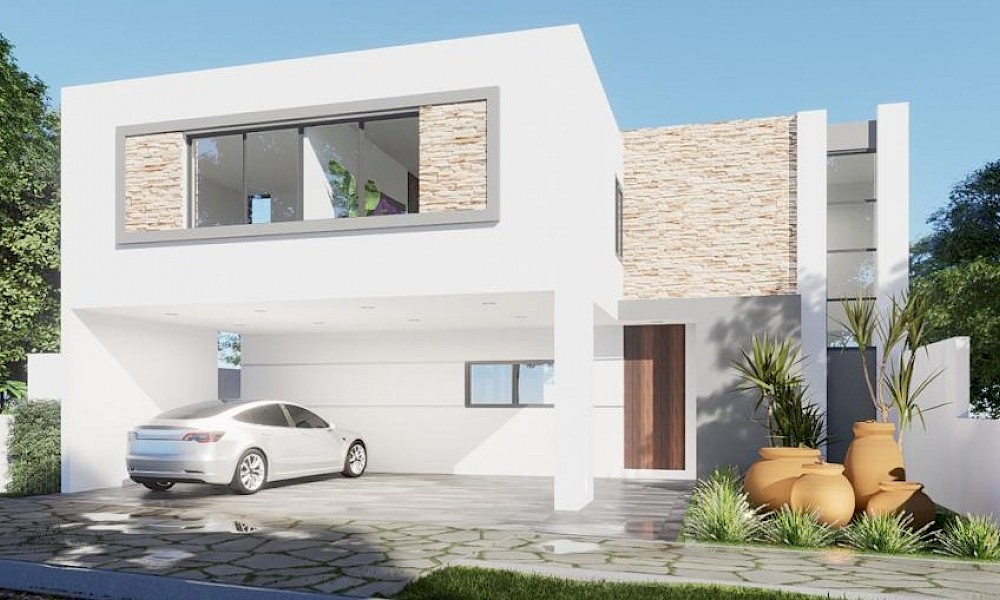 Este modelo se caracteriza por su armoniosa distribución en dos plantas, con tres habitaciones en planta alta, la principal con una amplia terraza apergolada y una habitación secundaria en planta baja con baño completo.