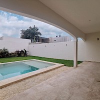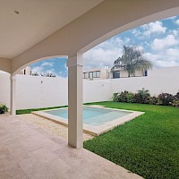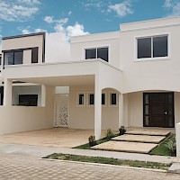 El modelo 16 cuenta con una fachada estilo californiana con tres amplias habitaciones en planta alta, la recámara principal con un balcón con vistas al área de jardín.