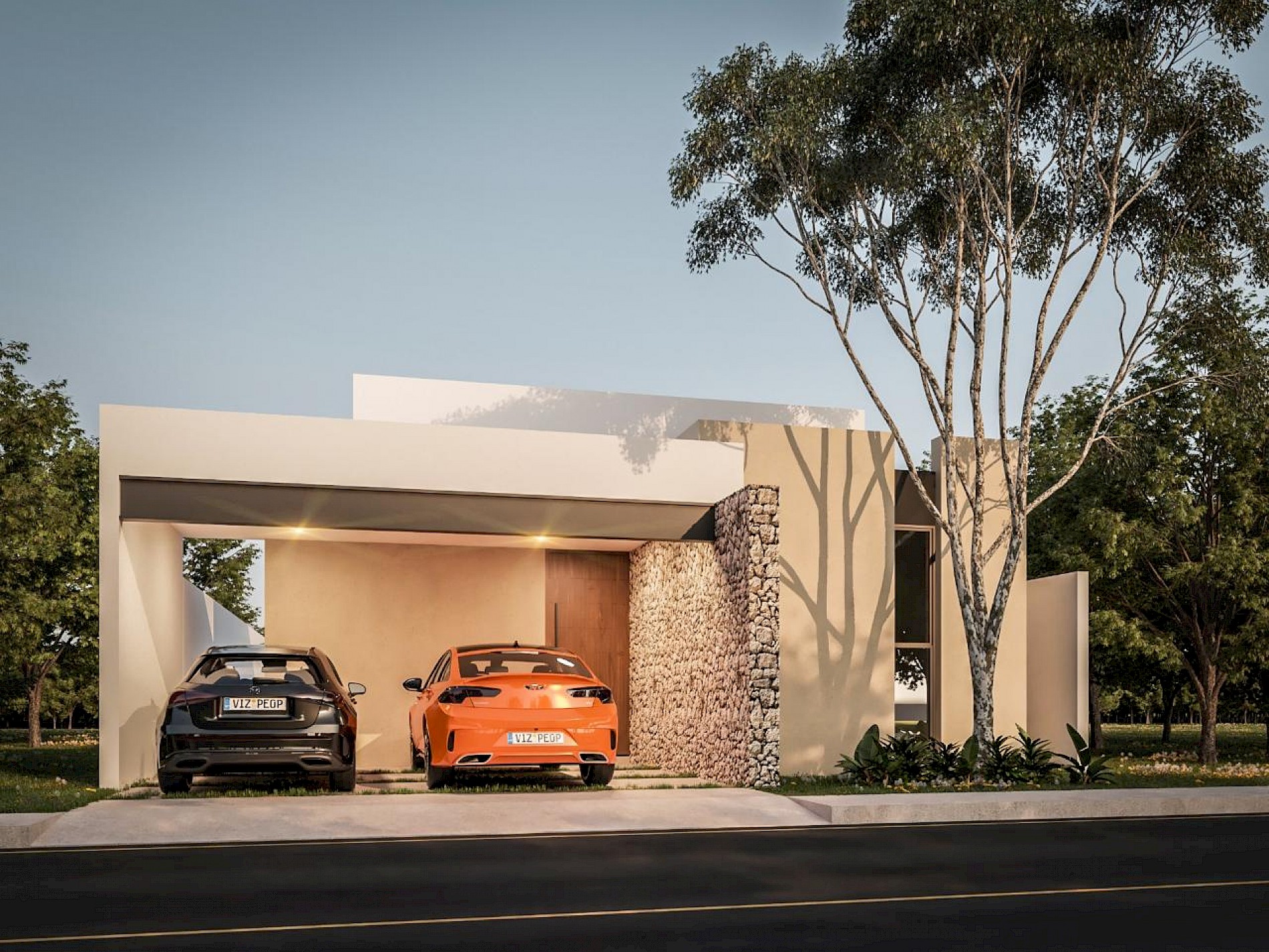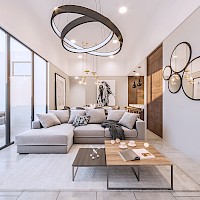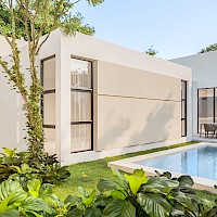 Este modelo se caracteriza por tener una distribución en una sola planta, con el área de sala-comedor a doble altura y vistas completas hacia el jardín, además de tres habitaciones completas, cada una con su baño.