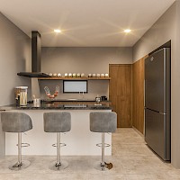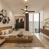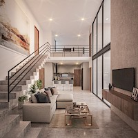 Este modelo se caracteriza por tener una distribución en dos plantas con el área de sala-comedor a doble altura, con vistas hacia el jardín y una habitación secundaria en planta baja, igual con vista hacia el jardín.