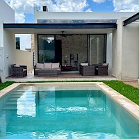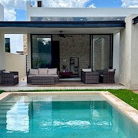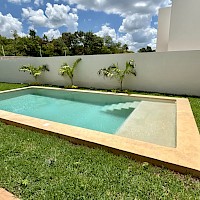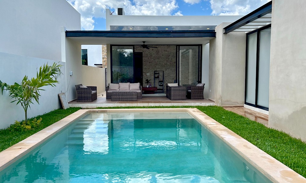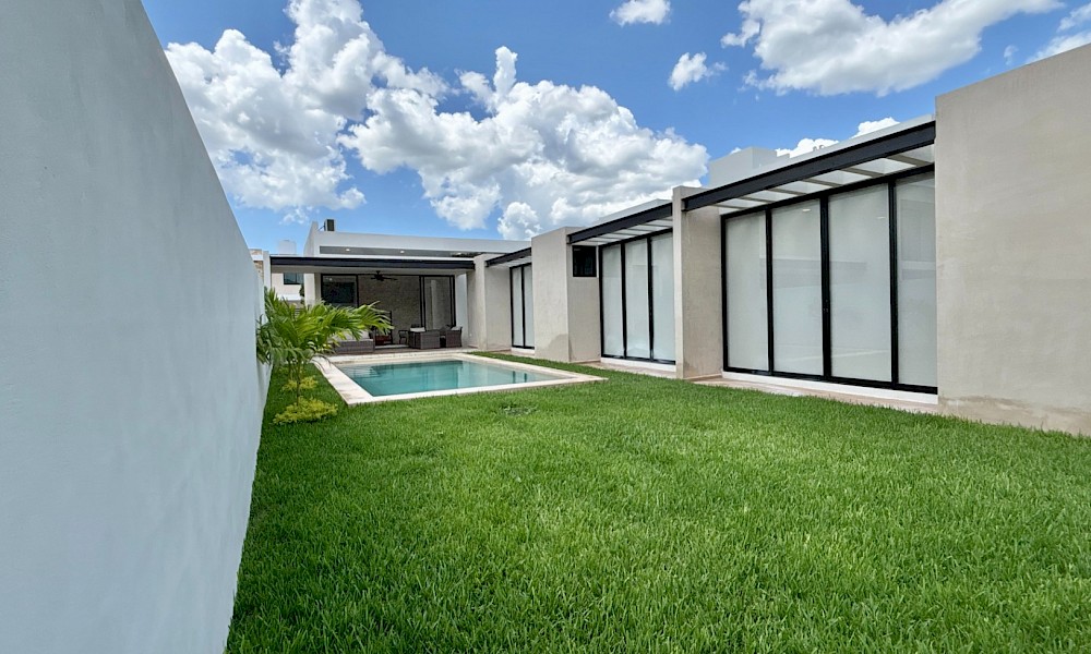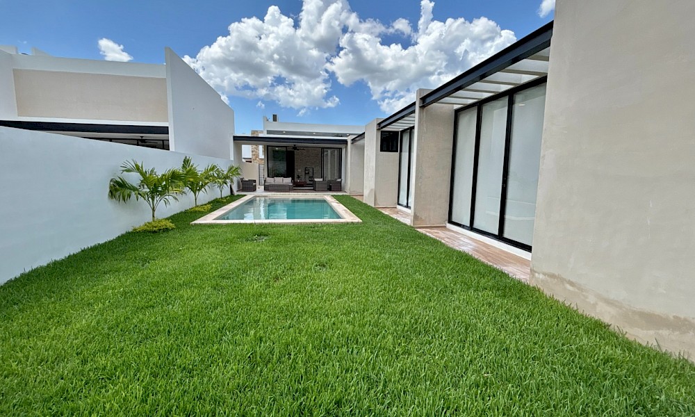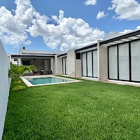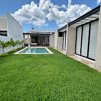 El modelo 270 se caracteriza por estar distribuido en una sola planta, tener tres amplias habitaciones, además de un área de jardín de buen tamaño.