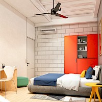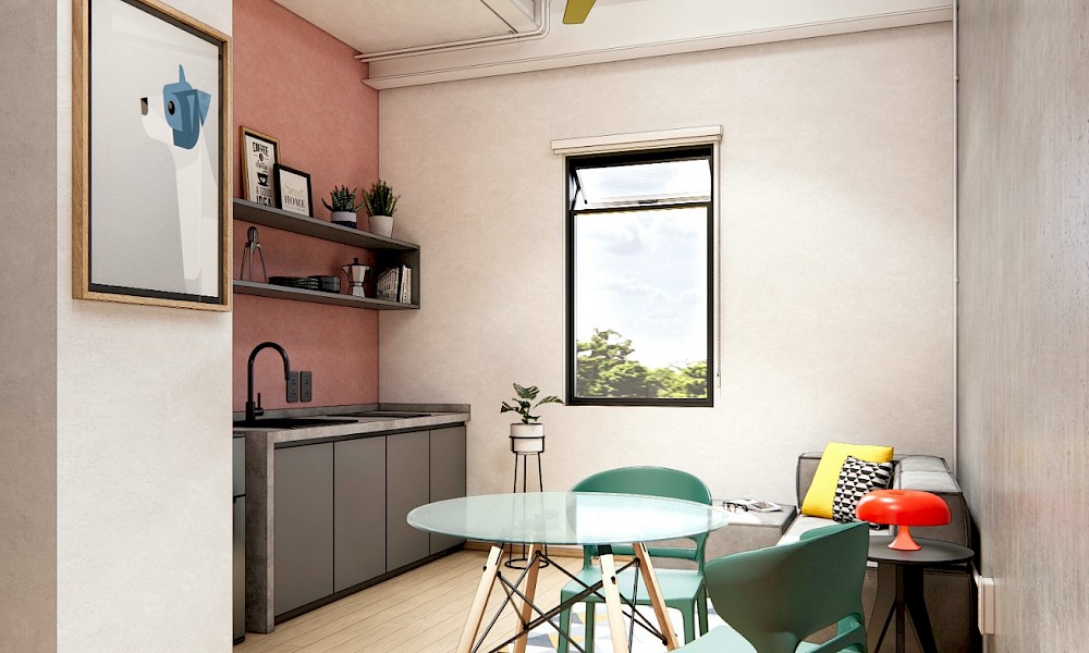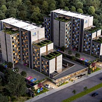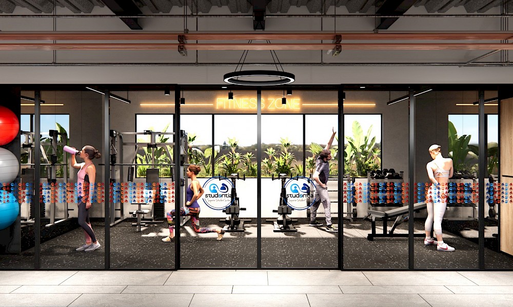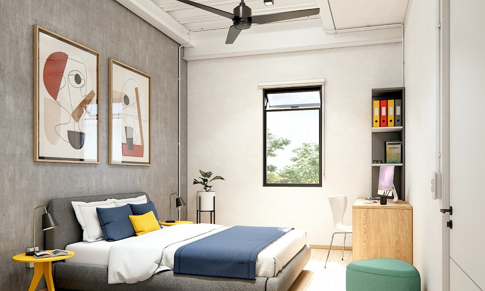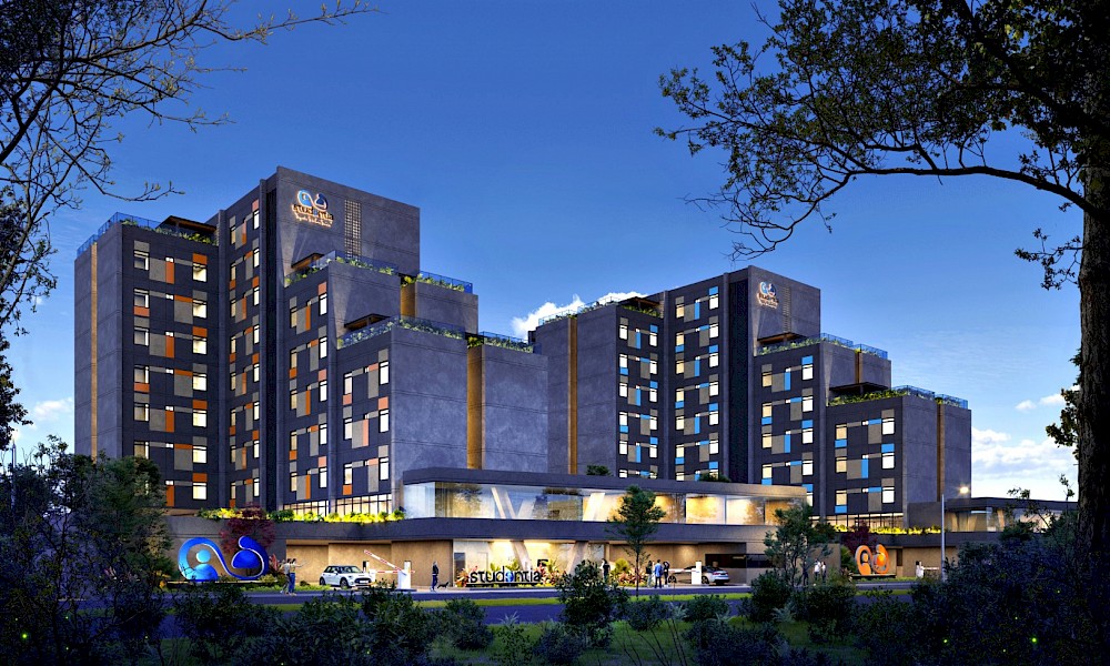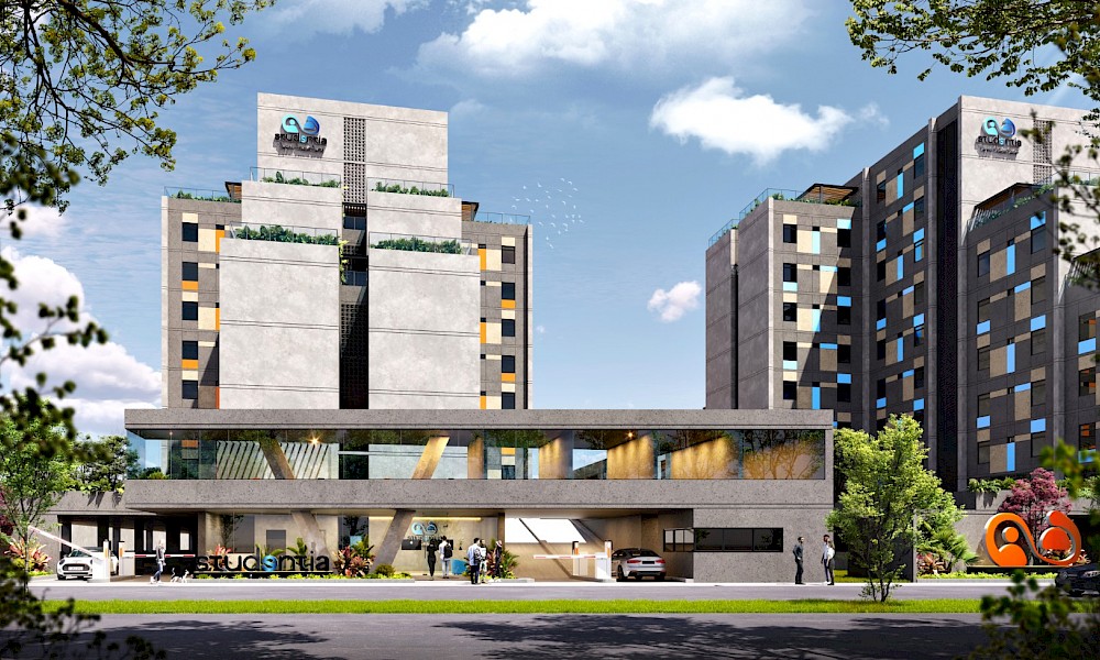 Studentia estará conformado por dos torres con 100 departamentos cada una, distrubuidos en 9 niveles. El modelo se puede adaptar con 1 cama, modelo invididual. O modelo Doble, con 2 camas.