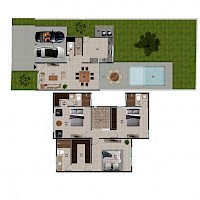 El modelo 168 se caracteriza por tener una distribución en dos niveles con tres habitaciones en planta alta.
