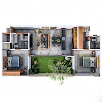 Este modelo se caracteriza por tener dos habitaciones con baño, y estar separadas completamente por el área social.