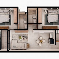El modelo B se caracteriza por contar con dos habitaciones, la principal con baño propio y una ubicación estratégica.