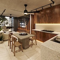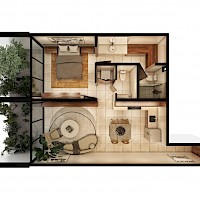 El modelo C se caracteriza por estar conformado por 1 habitación completa con baño, además de un baño de visitas. Un prototipo que divide la habitación del área social, ideal para aquellos que buscan mayor privacidad.