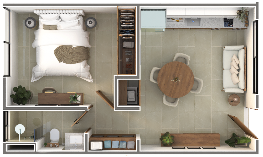 Nikora estará conformado de 42 departamentos divididos en dos torres de cuatro niveles y contará con amenidades propias como rooftop y área de asadores, entre otros. Este modelo se caracteriza por contar con una habitación con baño compartido con el área social.