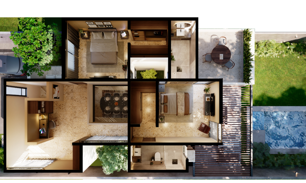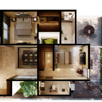 Zenara se conforma por 8 residencias dentro de régimen en condominio. El modelo Greta se caracteriza por contar con tres habitaciones, dos en planta alta además de una sala de T.V.