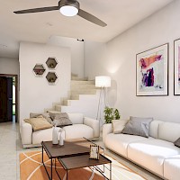 El modelo E se caracteriza por contar con tres amplias habitaciones, una de ellas en planta baja para mayor comodidad.