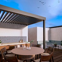 Este modelo se caracteriza por estar distribuido en tres niveles, contar con tres habitaciones y un rooftop con bar en el último piso.
