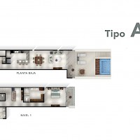 El modelo A se caracteriza por encontrarse en el primer nivel de la torre, con tres amplias habitaciones en planta alta, cada una con balcón con vistas hermosas de las playas.
