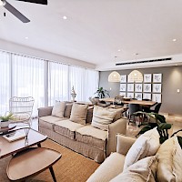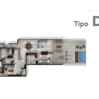 El modelo D se caracteriza por encontrarse en el primer nivel de la torre con una distribución práctica en una sola planta y con tres amplias habitaciones, una de ellas tipo "Lock Off" con área de sala, comedor, cocineta y terraza privada.