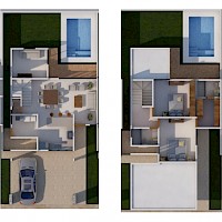 Este modelo se caracteriza por tener una distribución en dos plantas con el área de sala-comedor amplia y un estudio/recámara en planta baja.