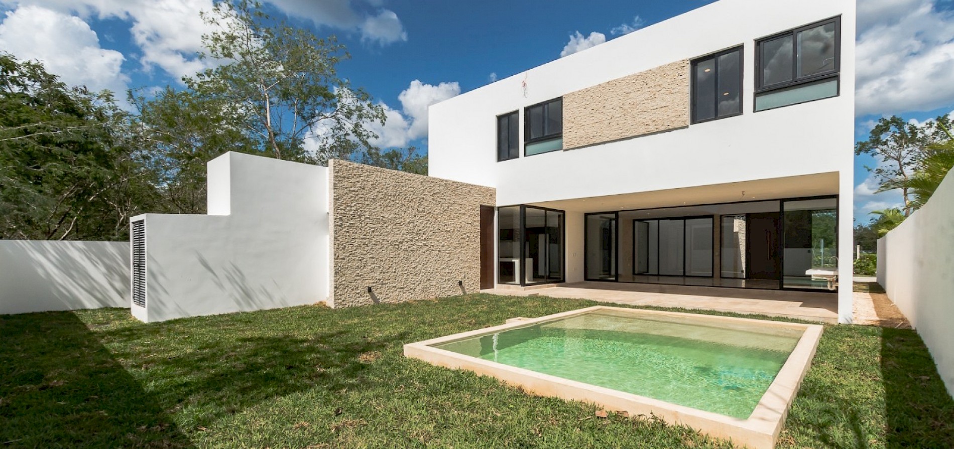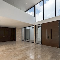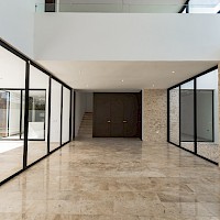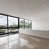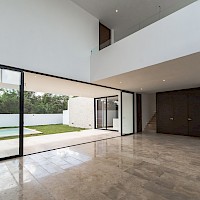 Esta residencia se caracteriza por tener una distribución en dos plantas con cuatro amplias habitaciones, una de ellas en planta baja para mayor comodidad, además de un área de sala a doble altura.