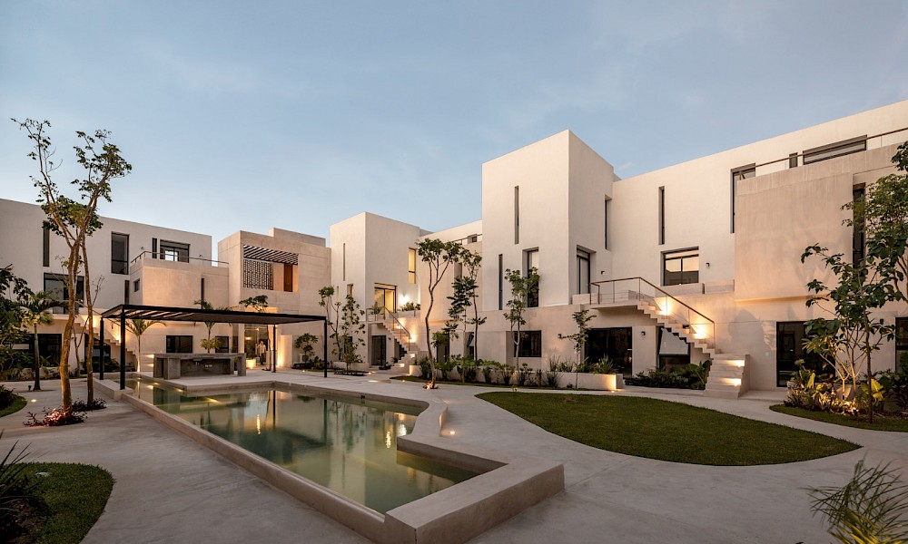 OMH, está conformada por 48 departamentos distribuidos en 12 torres con una terraza central para prácticar yoga y amplias áreas verdes para lectura y esparcimiento de los habitantes.