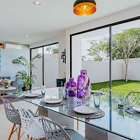 El modelo E se caracteriza por tener una sala-comedor con vista hacia el jardín y tres habitaciones en planta alta, una de ellas con clóset vestidor.