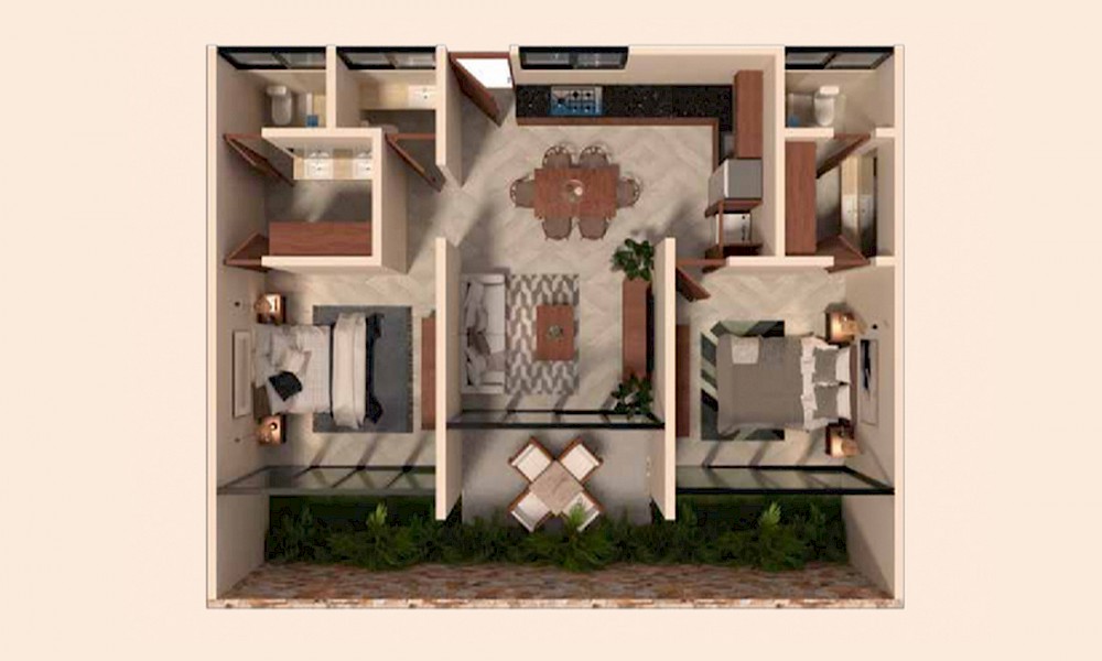 Este prototitpo se caracteriza por tener dos habitaciones con baño completo y clóset vestidor. Además de una terraza y área de jardín.