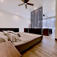 Este modelo se caracteriza por tener una habitación, espacios abiertos y, al estar situado en planta baja, cuenta con piscina y jardín privado.