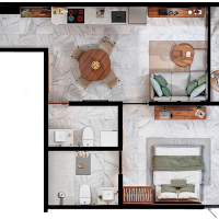 Este modelo se caracteriza por ser de una habitación y tener un baño y medio. Existen dos prototipos de una habitación, uno con el balcón en la habitación y el otro con el balcón compartido con el área social.