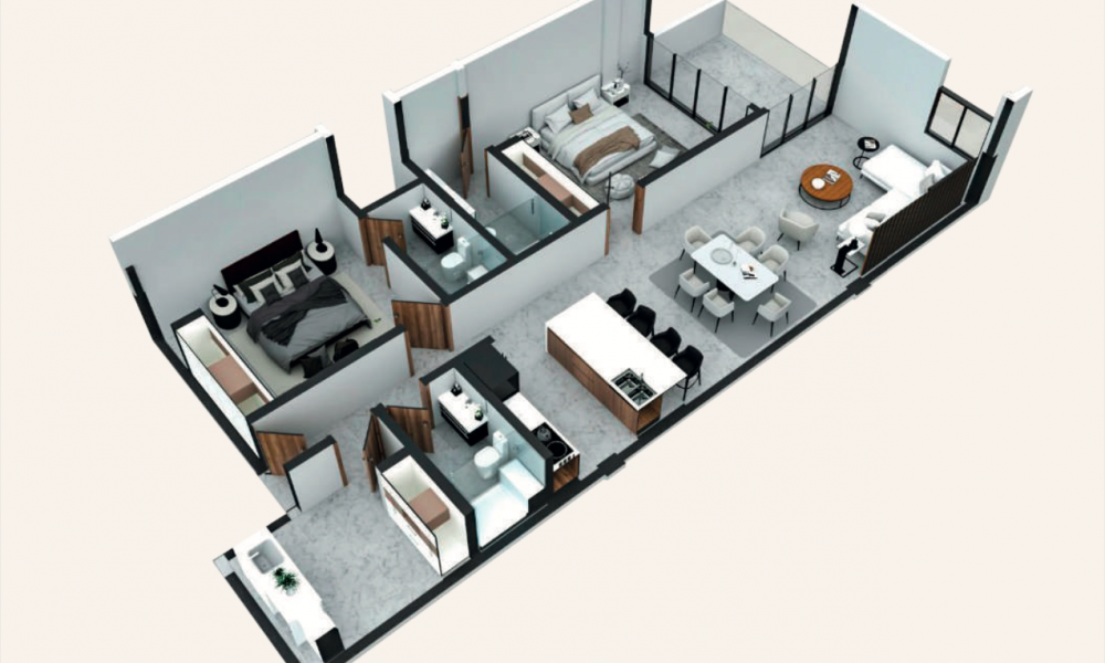 Este modelo se caracteriza por tener 2 habitaciones y 3 baños completos.