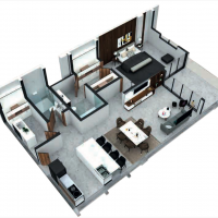 Este modelo se caracteriza por tener 1 habitación muy cómoda, con una terraza amplia que conecta con el área social, además de 2 baños completos.