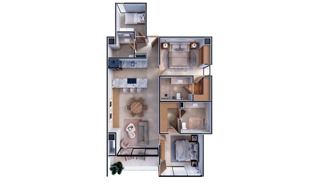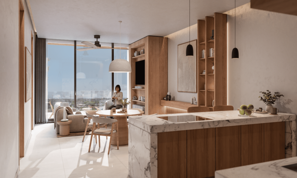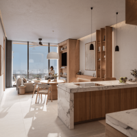 Este prototipo se encuentra en Torre Homes, la cual estará conformada de 36 departamentos distribuidos en 9 niveles. El modelo Double Flex se caracteriza por tener 2 habitaciones con clóset vestidor y baño, además de un flex room.