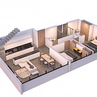 El penthouse modelo B se caracteriza por contar con un área de sala-comedor a doble altura con mezzanine o sala de tv en el segundo nivel, además de un rooftop con vistas hermosas de la ciudad.