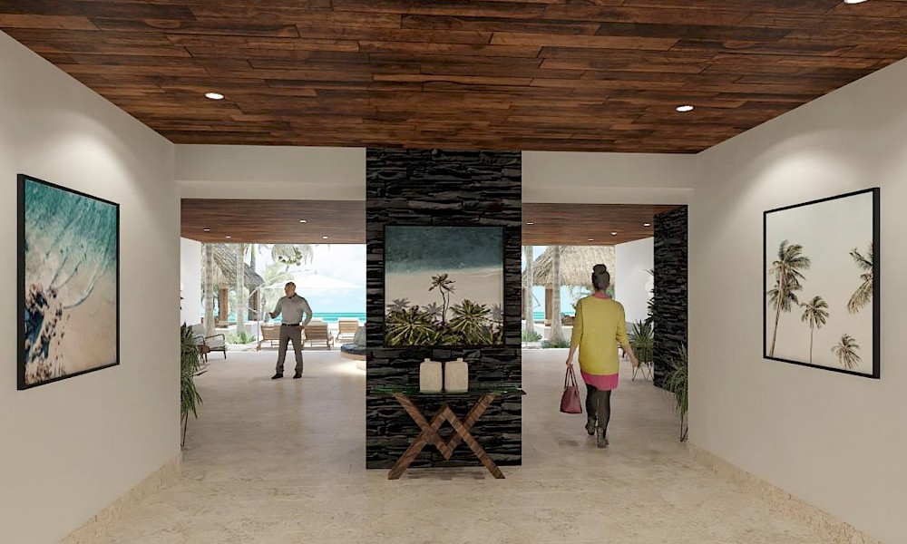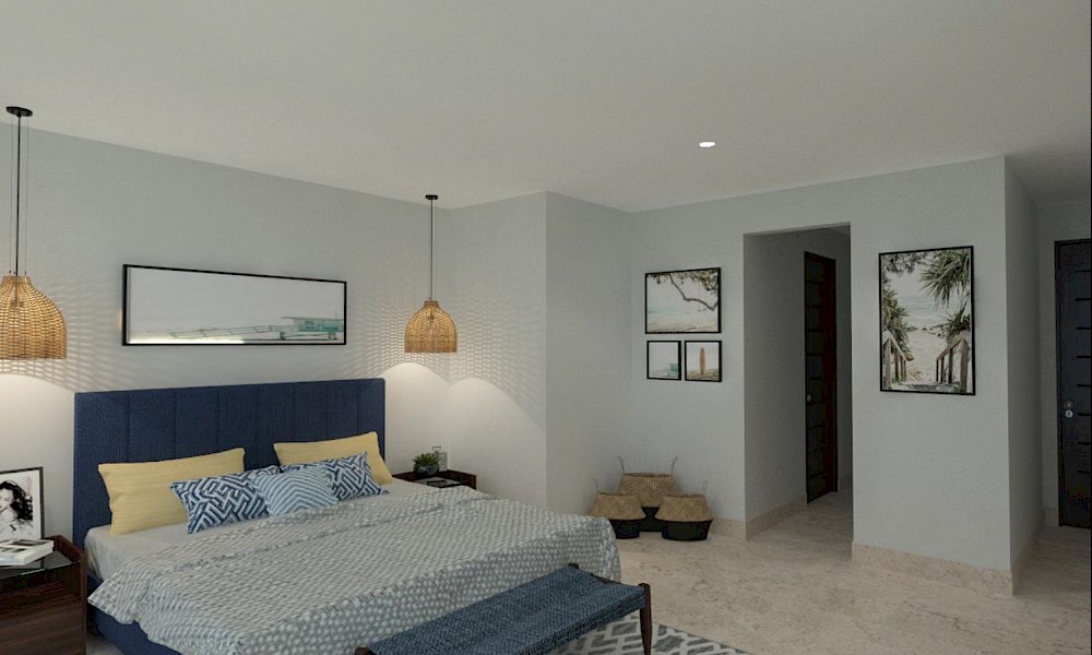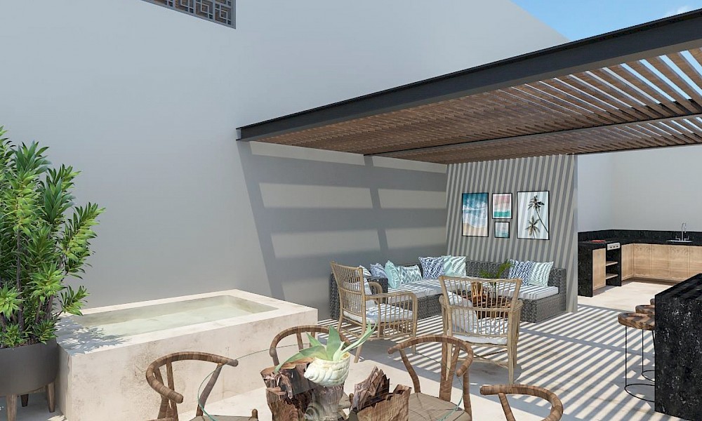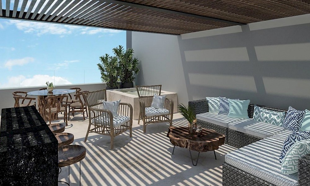 El modelo Penthouse está distribuido en tres niveles y ubicado a partir del tercer y cuarto nivel de la torre. Constará de tres amplias habitaciones, la principal con balcón, además de un rooftop con área de cocineta, asadores, sala con bar techado con pérgola y un pequeño jacuzzi-pileta con maravillosas vistas del mar.