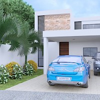 Este modelo se caracteriza por tener una habitación en planta baja y dos en el segundo nivel, además de una amplia piscina.