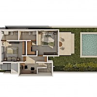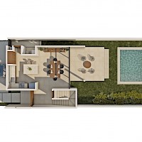 Este modelo se caracteriza por contar con dos amplias habitaciones en planta alta, así como un área exclusiva destinada para Home Office, adaptándose a las nuevas necesidades de la vida laboral.