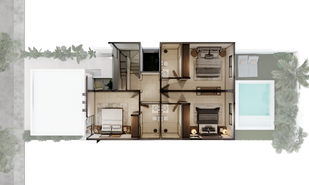 Este modelo se caracteriza por contar con dos habitaciones en planta alta, cada una con baño propio.