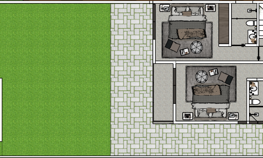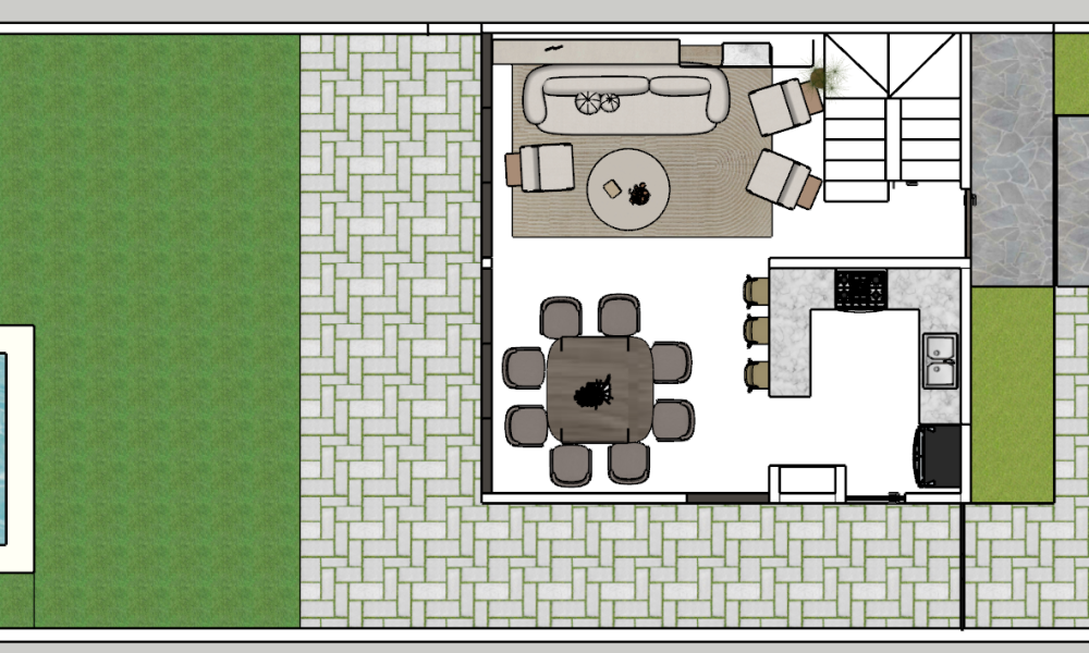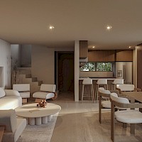 Este modelo se caracteriza por tener una distribución en dos plantas con el área de sala-comedor amplia y dos habitaciones en planta alta.