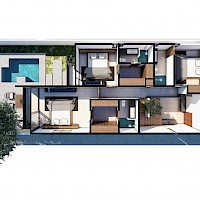 Este modelo se caracteriza por tener cuatro habitaciones, una de ellas en planta baja y un espectacular vestíbulo a doble altura que nos brindará mayor iluminación y ventilación.