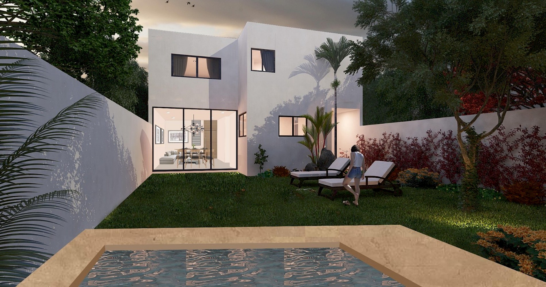 Este modelo se caracteriza por contar con tres amplias habitaciones en planta alta y una piscina en el área del jardín.