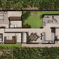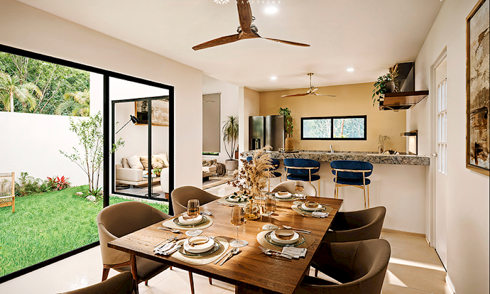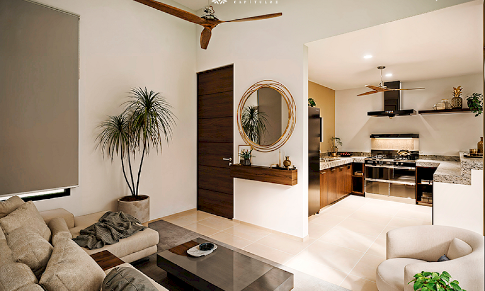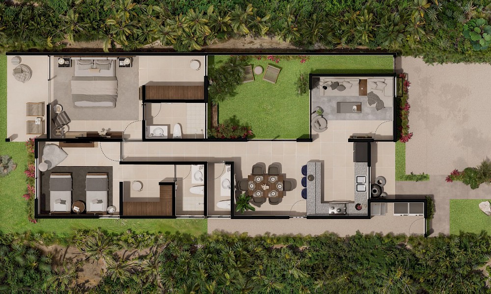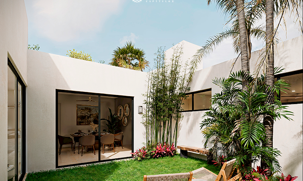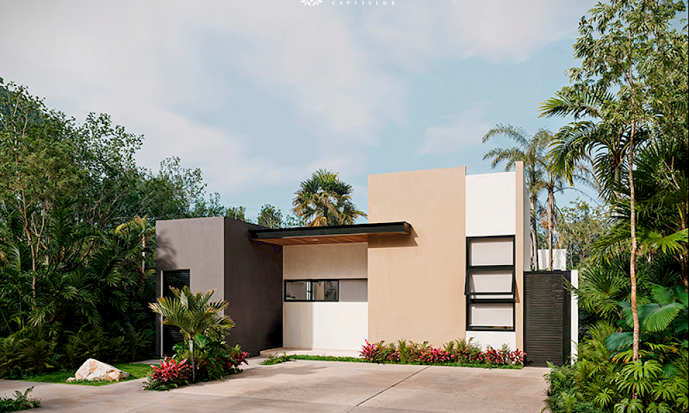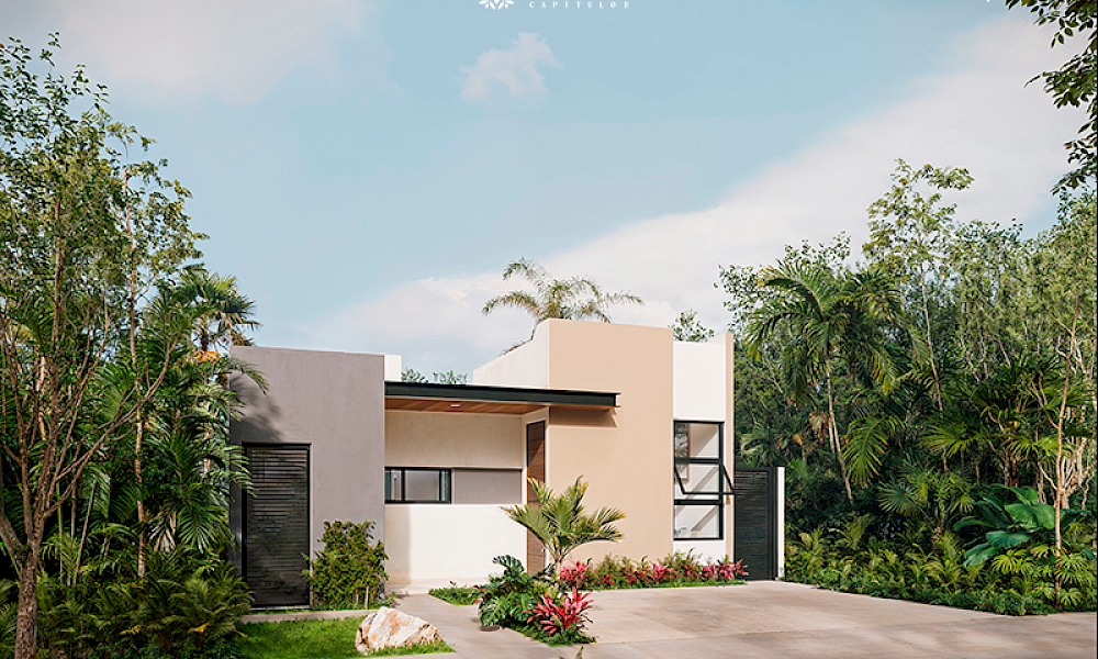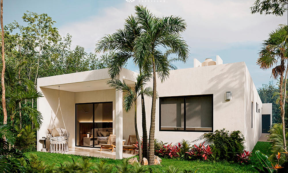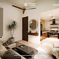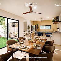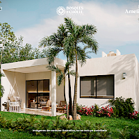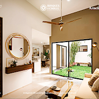 El modelo Amelia se caracteriza por contar con una distribución en un solo nivel con dos habitaciones y un patio central.