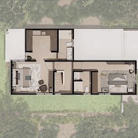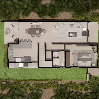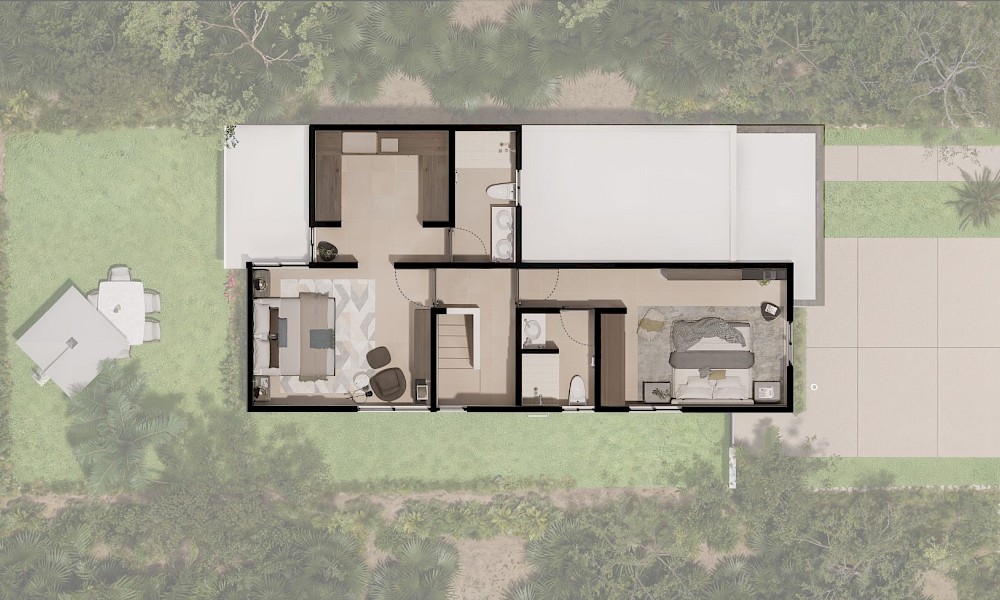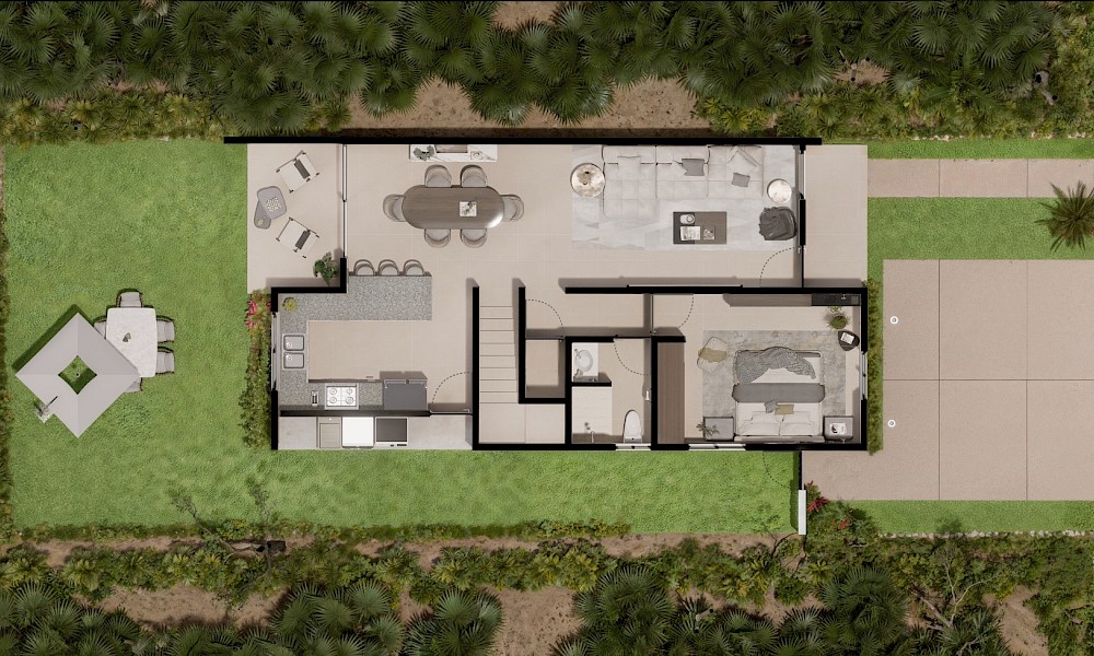 El modelo Davalia se caracteriza por una distribución que nos brinda una doble altura en el área de la sala, una habitación en planta baja, además de 2 habitaciones en planta alta.
