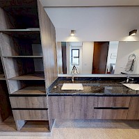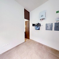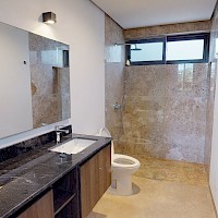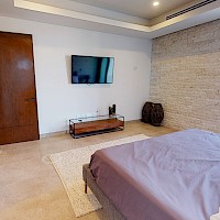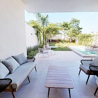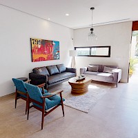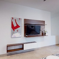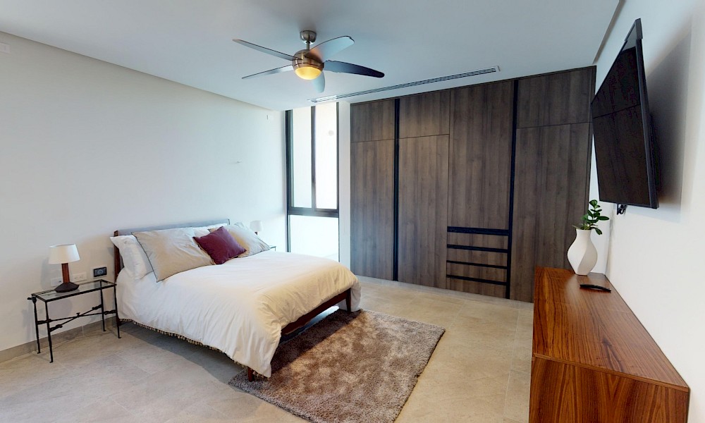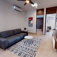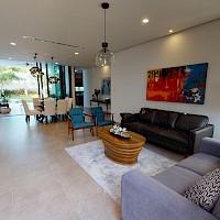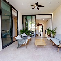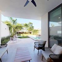 Este modelo se distingue por su terraza techada en la planta baja y por su sala de TV y balcón en la planta alta.