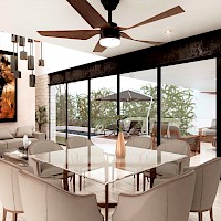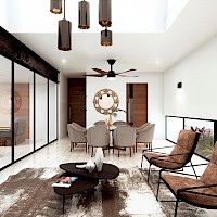 Este modelo se distingue por tener en la planta baja una sala de TV con clóset de blancos y una habitación con patio.