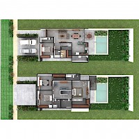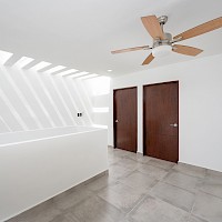 Este modelo se carcteriza por su distribución equilibrada en dos plantas con cuatro habitaciones, una de estas con la practicidad de encontrarse en el primer nivel.