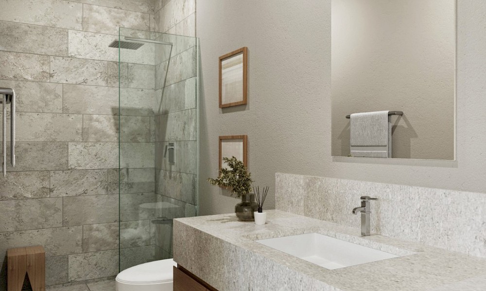El modelo D se caracteriza por tener el área social de gran tamaño y dos habitaciones, una de ellas con baño compartido.