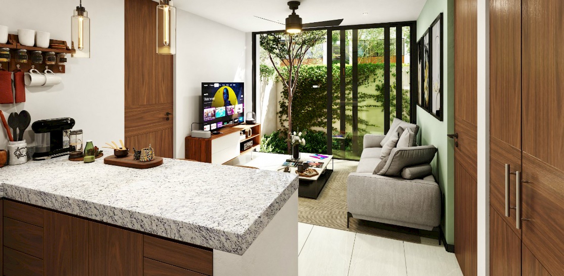 Bona estará conformado por 42 departamentos divididos en dos torres de tres niveles con departamentos de 1 y 2 habitaciones. El modelo Garden se carecteriza por contar con una amplia habitación y contar con la opción de estar en planta baja con área de jardín y piscina.