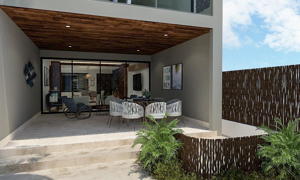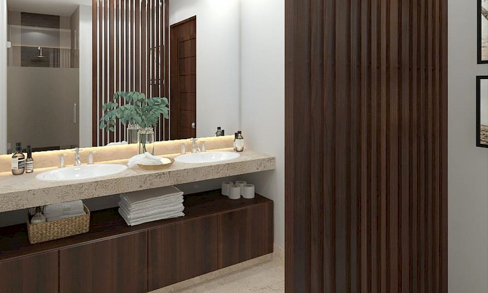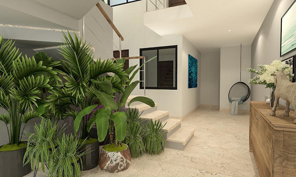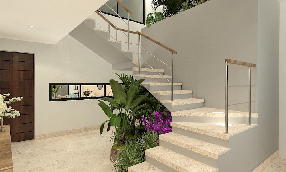 El modelo Garden está distribuido en dos niveles y ubicado en la planta baja de la torre. Constará de tres amplias habitaciones, la principal con balcón con vistas al mar, así como un cuarto de TV con baño completo en el primer nivel que puede ser opción para una cuarta habitación.