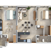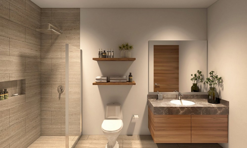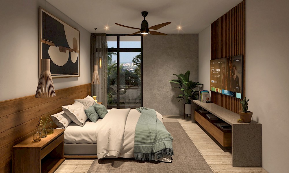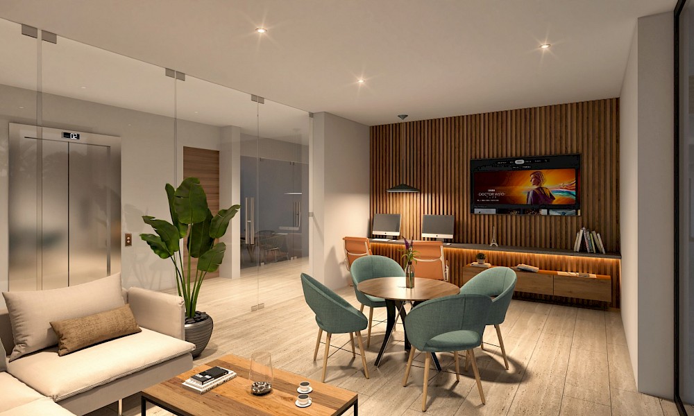 Con un sello arquitectónico atemporal, este complejo estará conformado por 30 departamentos divididos en una torre de cinco niveles con departamentos de 1 y 2 habitaciones. El modelo A se carecteriza por contar con una amplia habitación, contar con la opción de un flex y estar en planta baja con área de terraza, jardín y piscina.