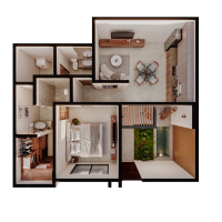 Este departamento se caracteriza por contar una habitación con baño completo y baño de visitas, además de una terraza con jardín.