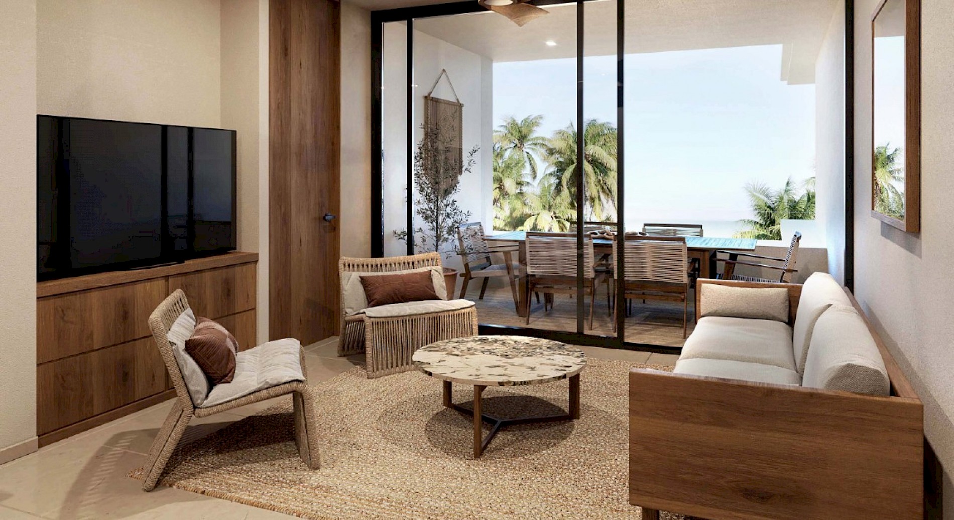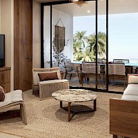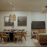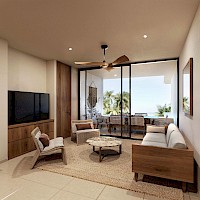 El modelo Clásico está distribuido en un nivel con tres habitaciones y un área de sala-comedor con vistas a la terraza.