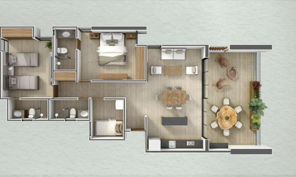 Este prototipo se caracteriza por tener 2 habitaciones con baño propio + un espacio flex.