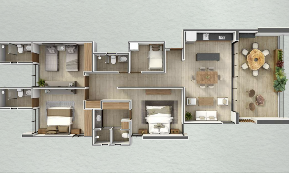 Este prototipo se caracteriza por tener 3 habitaciones con baño propio + un espacio flex.